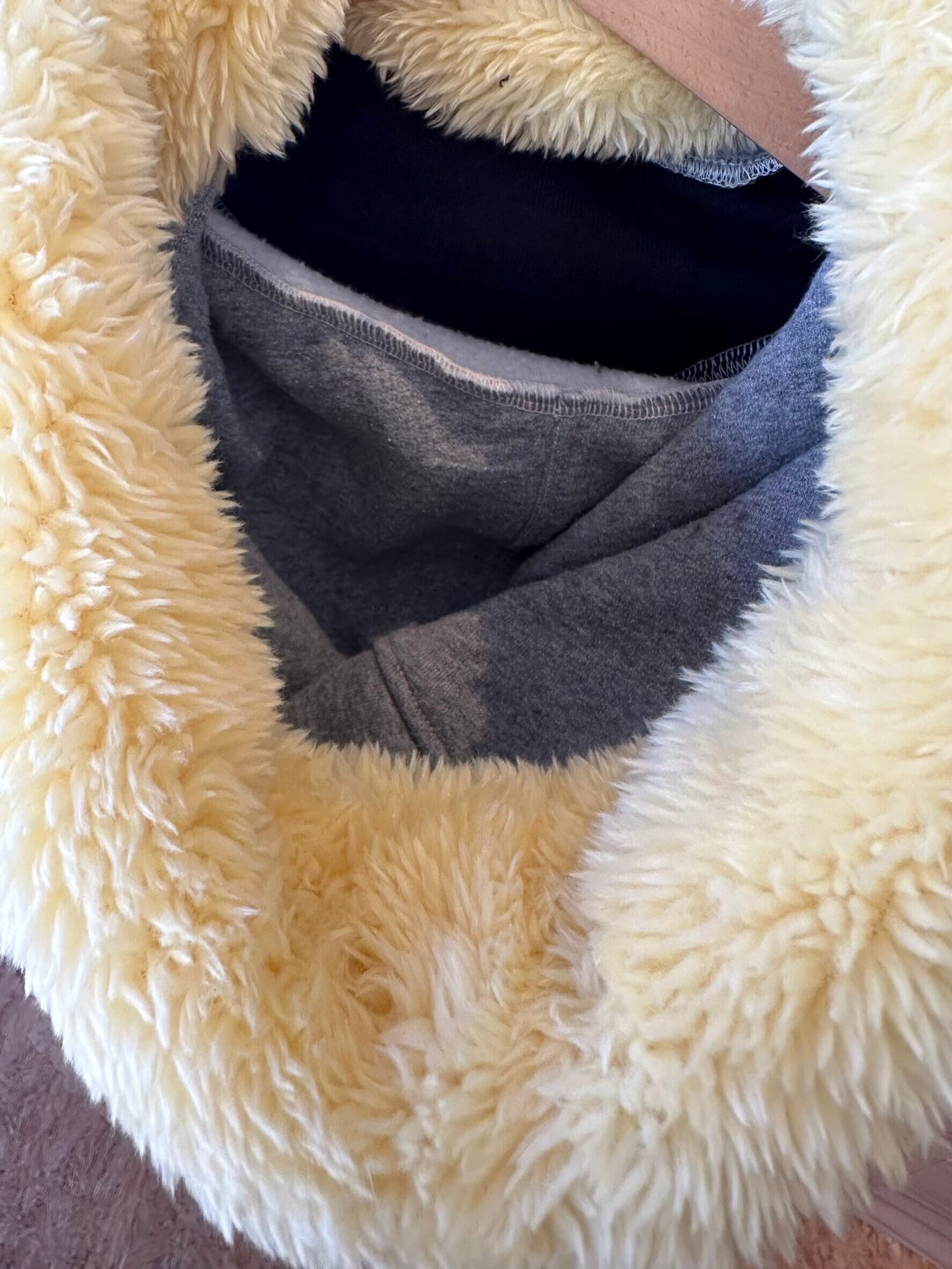 フードは二重仕様で、縁はボアで冬仕様に!色もこだわって切り替えています